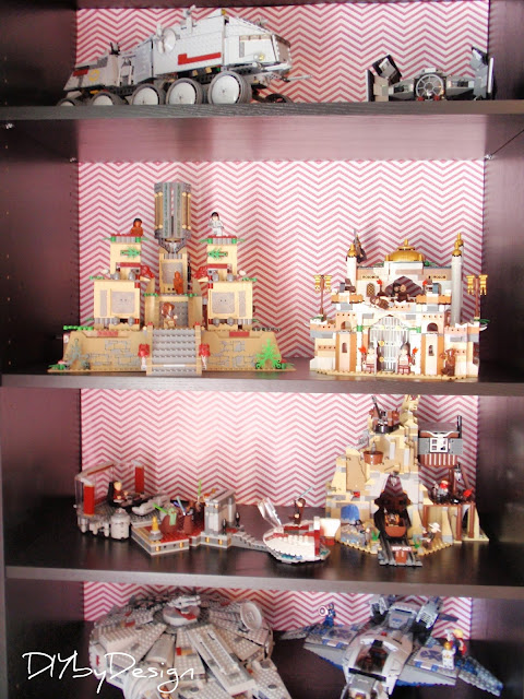 One of the biggest things accomplished by this makeover, is the creation of display space for my son's many, many completed Lego sets. If you have a child who builds Legos and then likes to display them, you know it can quickly take over so much space in your home. So many of these sets were relegated to the closet and didn't really get to be displayed at all.